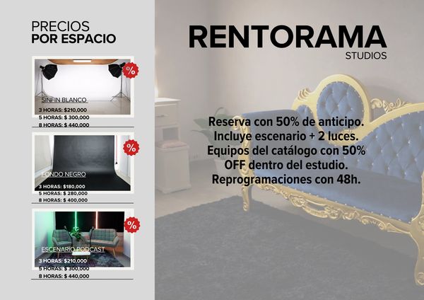 Cada escenario puede transformarse según tus necesidades, combinando fondos, mobiliario e iluminación profesional.